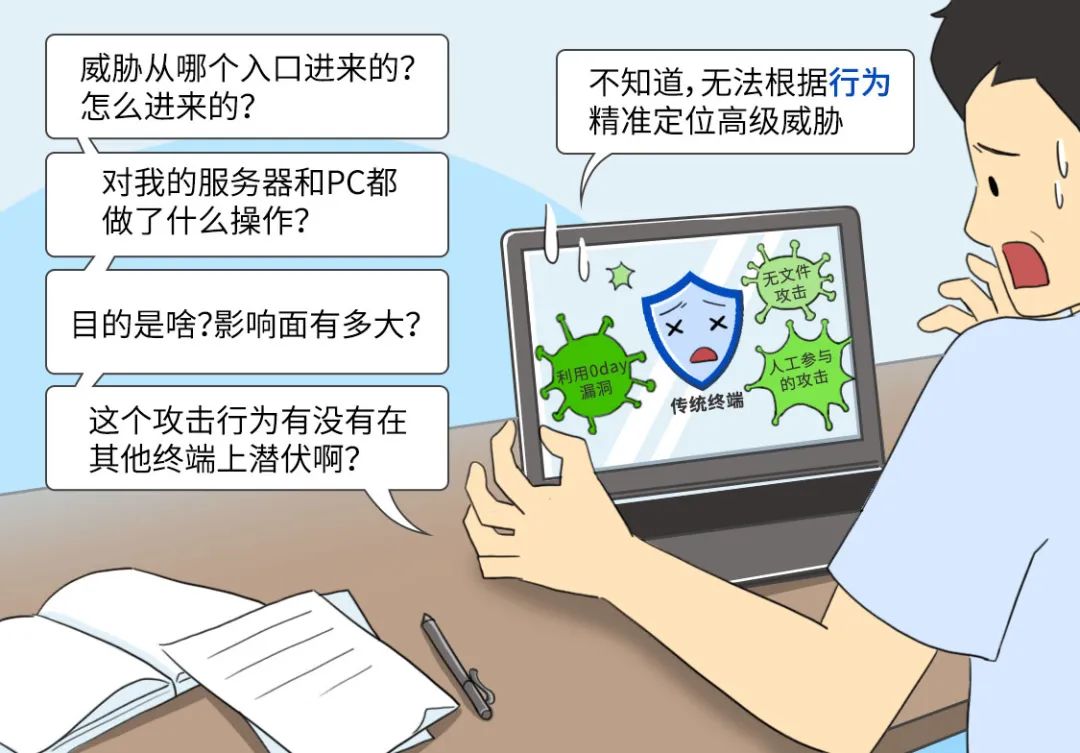 新型复杂威胁层出不穷,如APT类攻击、人工参与的攻击行为等。高级威胁可变幻各种攻击手法入侵,绕过安全检测,而“终端”是高级威胁进入单位内