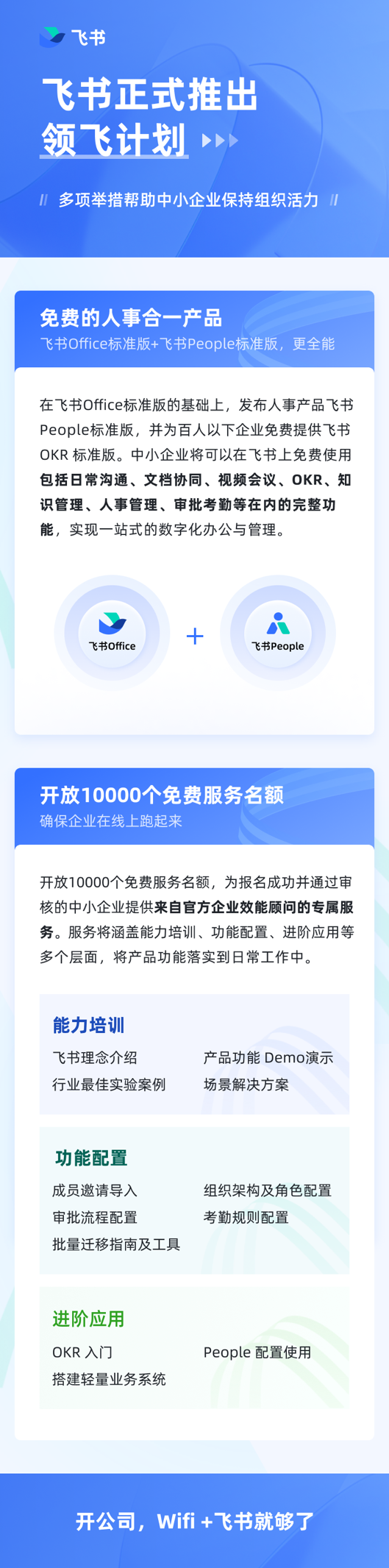 5月25日,飞书举行春季未来无限大会,飞书首席商业官林婵宣布推出“领飞计划”。该计划包含了一揽子中小企业扶持方案,飞书将为中小企业免费提