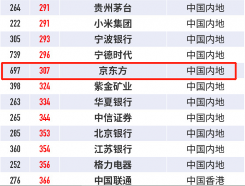 5月12日,美国《福布斯》杂志发布2022全球企业2000强榜单,中国(包括港澳台地区)今年的上榜企业数量达399家, BOE(京东方)位列第307位,较去年大