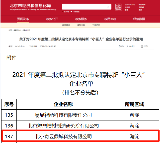 近日,北京市经济和信息化局发布《关于对2021年度第二批拟认定北京市专精特新“小巨人”企业名单进行公示的通知》。