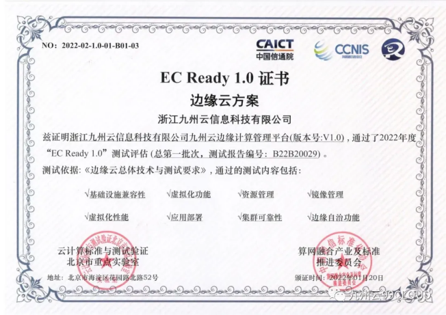 九州云通过EC Ready边缘云权威评测