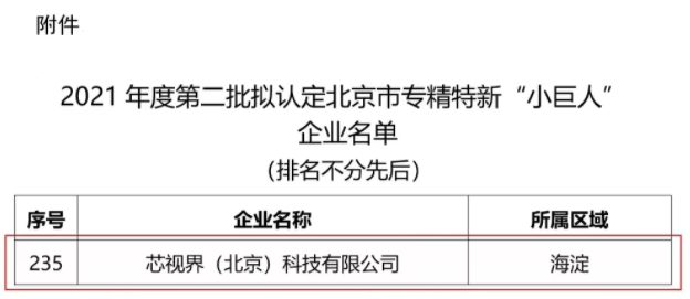 近日,北京市经济和信息化局公示了2021年度第二批拟认定北京市专精特新“小巨人”企业名单。芯视界科技凭借其在创新引领、行业影响力、突破关键