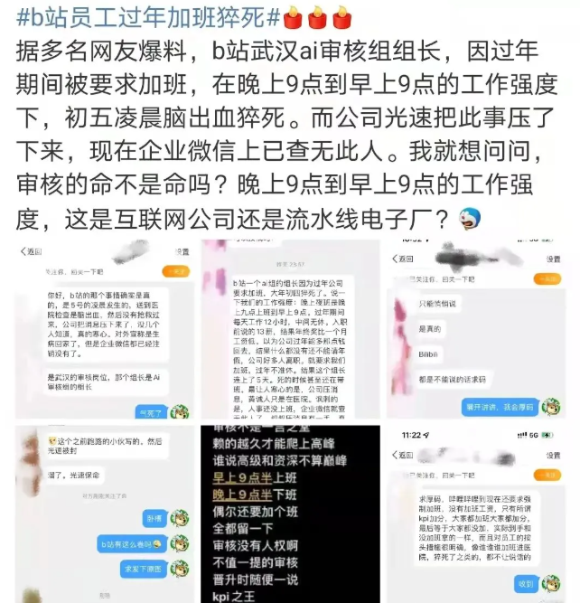 2月7日,有网友在微博爆料称视频网站哔哩哔哩武汉AI审核组组长疑似春节加班期间猝死。2月8日晚,B站官方微博账号对相关网传情况作出回应,否认
