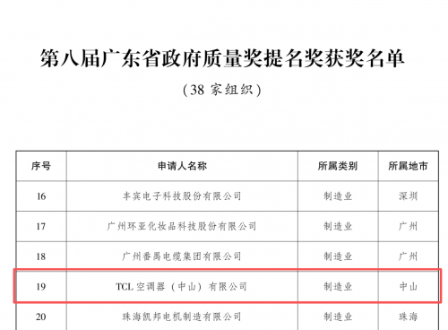 近日,第八届“广东省政府质量奖提名奖”获奖名单公布。TCL空调凭借其卓越的质量管理体系、领先的技术创新能力和突出的市场表现成功入选,荣获