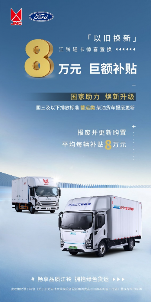 在环保与可持续发展成为时代主旋律的当下,货运领域的节能减排工作正在加速推进。国家政策的赋能背书,支持老旧营运货车报废更新,江铃轻卡积