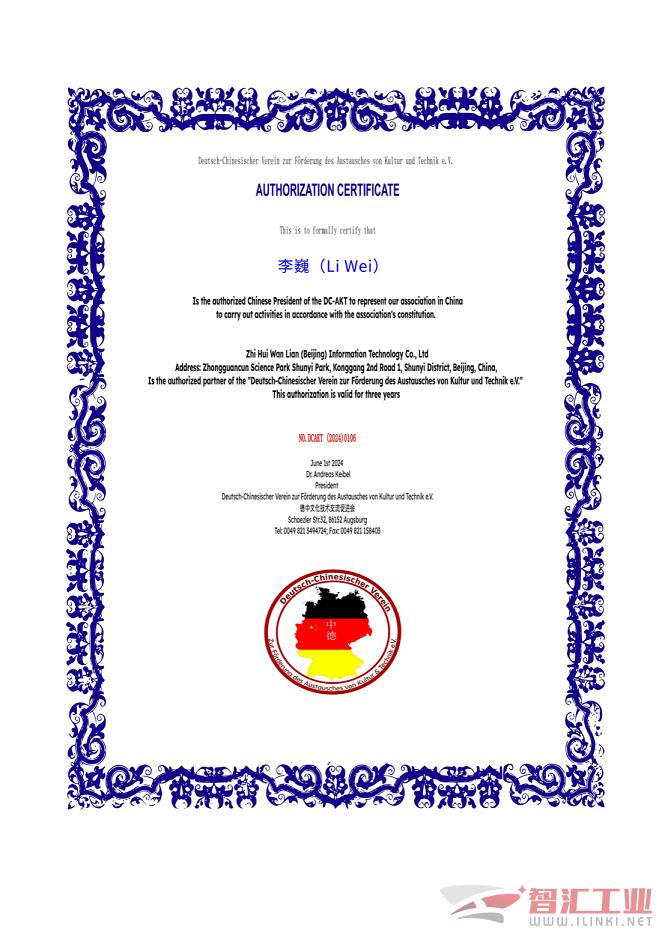 近日,德中文化技术交流促进会理事会表决通过,授予智汇万联(北京)信息技术有限公司(以下简称“智汇工业”)创始人李巍女士为德中文化技术