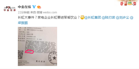 9月3日,中金在线官方微博晒出长虹营业执照。在经营范围中,“餐饮服务”一词被标红处理,疑似与9月5日即将公布的“大事件”有某种关联。