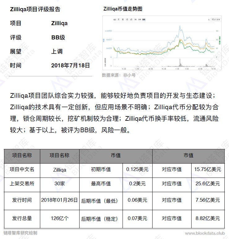 近日,链塔智库BlockData发布《Zilliqa项目评级报告》,将Zilliqa评为BB级,项目落地有待考证,代币流通风险大。