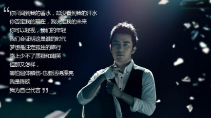 2012年,陈欧轻装上阵为创立品牌聚美优品拍了一支宣传片,此后,“我为自己代言”成了陈欧的代名词,也让聚美优品顺势走红。