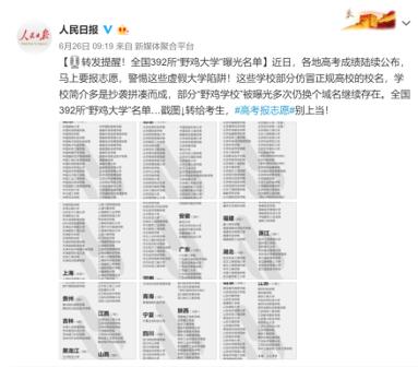 随着高考成绩的陆续公布,家长们也开始通过各个渠道来为自家考生寻找“重点学校”。而近日人民日报在官方微博高调曝光的虚假大学名单也在提醒