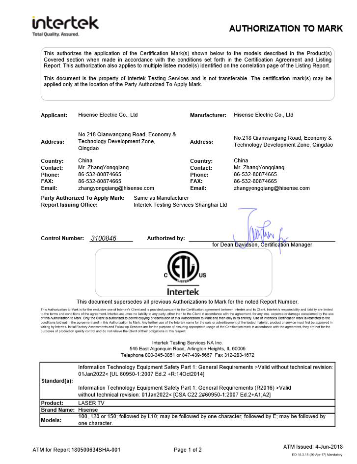 “海信激光电视目前已经取得了美国、欧洲的市场准入认证证书,并获得了在国际上互认的CB证书,三者对于海信激光电视对人体的安全性进行了严格