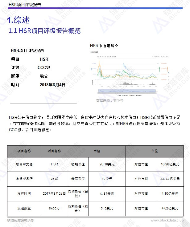 近日,链塔智库针BlockData将HSR评为CCC级,即项目风险很高。