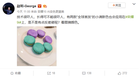 5月30日,荣耀总裁赵明在微博上进一步透露了关于新品荣耀9i的关键产品信息,确认了荣耀9i将会搭载“很吓人的技术”,并且暗示荣耀9i将会有紫色