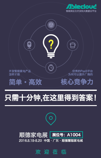 8月18-20日,物联网自主开发和大数据云平台AbleCloud将参展由中国机电产品进出口商会、顺德区人民政府、科隆展览有限公司、慧聪网联合主办