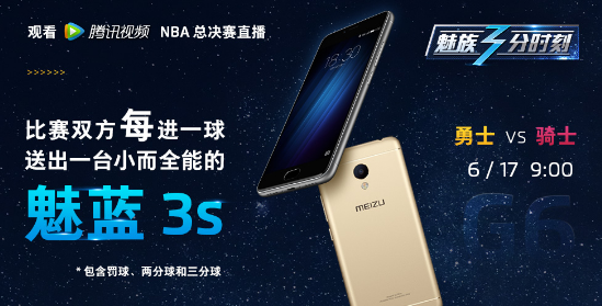 在NBA总决赛进入到第六场后,比赛每进一个球(包括罚球、两分球、三分球),魅族都将送出一部魅蓝3s手机。按照此前比赛的进球数量,第六场比赛