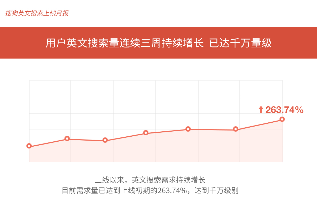 5月19日,搜狗搜索对接微软必应全球搜索技术,推出搜狗英文搜索、搜狗学术搜索两个垂直频道。一组来自搜狗搜索的最新数据显示,用户英文搜索量