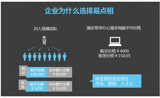 易点租的商业模式看上去相当简单:需要用电脑的企业,只需在线提交申请,通过信用资质评审,即可拿到一个免押金租赁IT设备的额度,所需电脑等