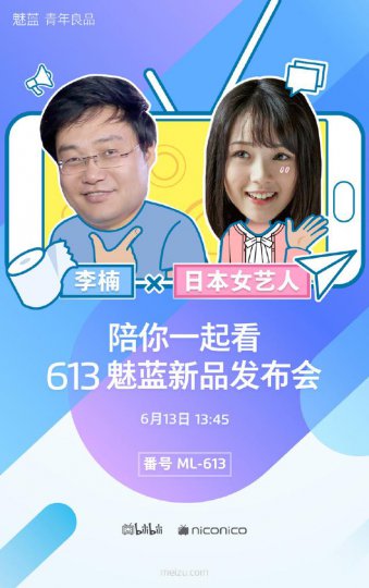 魅蓝手机官博发出海报称,魅族副总裁李楠将与日本女艺人蜜丽娅(Miliya)在 bilibili 、niconico 同台直播魅蓝新品发布会。