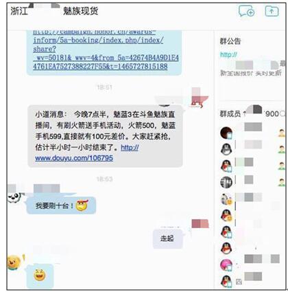 昨日,魅族邀请了人气模特陈潇在斗鱼TV直播拍卖手机,刷斗鱼道具火箭抢魅蓝3,限量100台。笔者从多个黄牛QQ群了解到,已有多位黄牛参与了本次