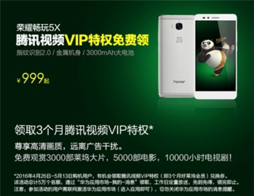 4月26日,荣耀联合腾讯视频强力打造荣耀畅玩5X新看片神器概念,并给予消费者VIP级福利待遇。据了解,近期新购买荣耀畅玩5X用户将有机会免费获