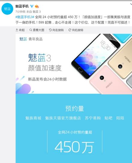 4月25日,魅族在北京国家会议中心正式发布了新一代青年良品,魅蓝3。在发布会结束后马上开启预约,其24小时全网预约量突破了450万台,目前,预