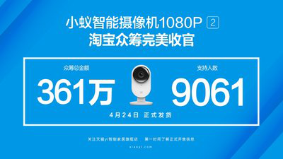 在淘宝众筹上线一个月的小蚁智能摄像机1080P 2于4月23日晚完美收官,累计众筹金额361万,超过9000人支持此众筹项目。