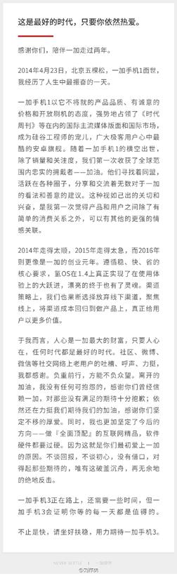 今天早上,刘作虎发布了一条长微博,名为《这是最好的时代,只要你依然热爱》。原来明天(4月23日)就是一加手机一代发布两周年的纪念日。