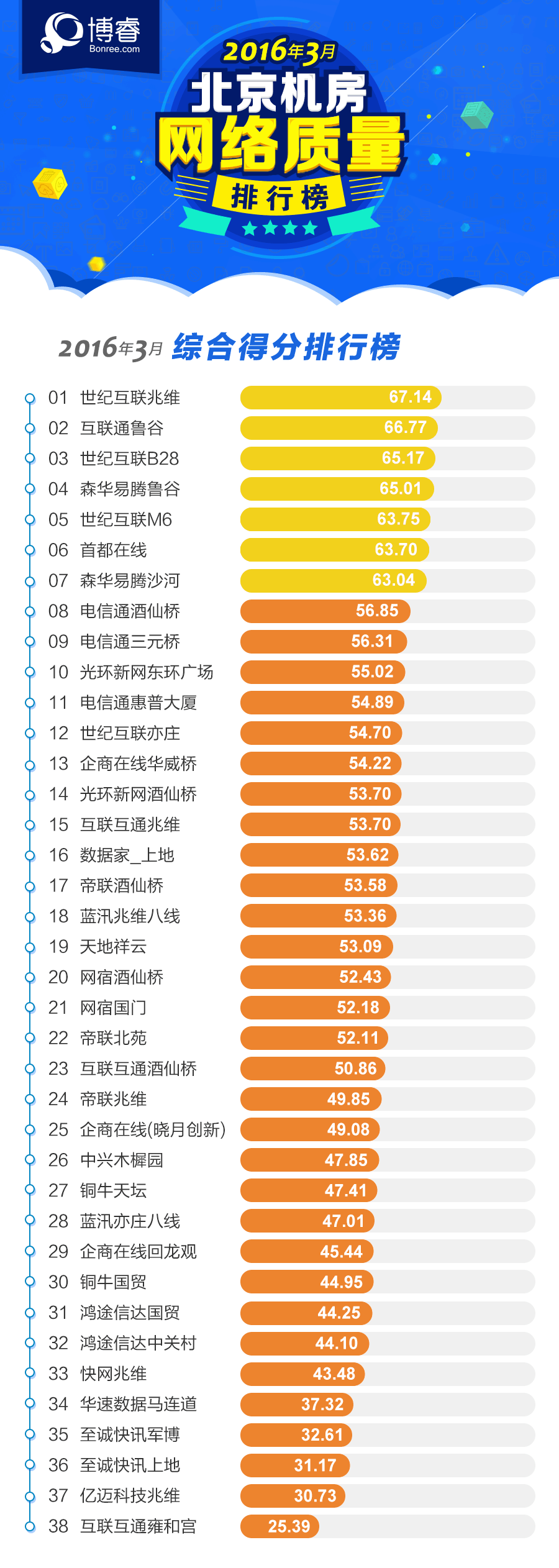 经过每月测试超过2700余万次数据采样测试,最终获取的数据包括丢包率和时延两个参数,根据上述两个指标对北京市内各大机房的网络质量进行评
