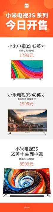 从小米公司得到消息,今日10点,小米电视3S 43英寸版、小米电视3S 48英寸、小米电视3S 65英寸超薄曲面在小米网再次开卖。