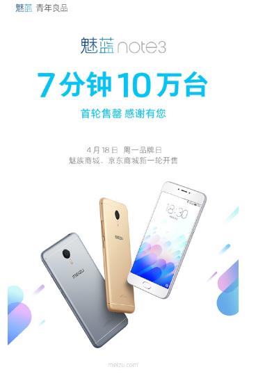 今日,魅蓝note3在魅族商城以及京东商城首发上市,现货10万台7分钟售罄,4月18日将会开启第二轮发售。截止昨晚10点,魅蓝note3预约量突破1200
