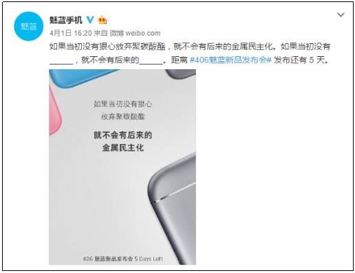 距离魅族4月6日魅蓝新品发布会仅剩下一天时间,按照魅族过往发布会的惯例,新机的不少特性都会从官方微博上放出的倒计时海报上露出,而据闻将