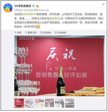 3月25日上午,360手机f4正式开售,仅仅6分钟,首批共99716台360手机f4迅速售罄。在当天下午,360手机公司方面举办了庆功会,祝芳浩更是大派红