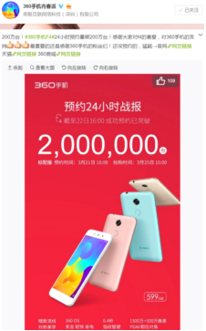 360手机f4于3月21日在北京正式发布,当天16:00在360商城、天猫商城、360手机商城同步开启预约。截至22日下午两点,该机成功预约量已经高达165