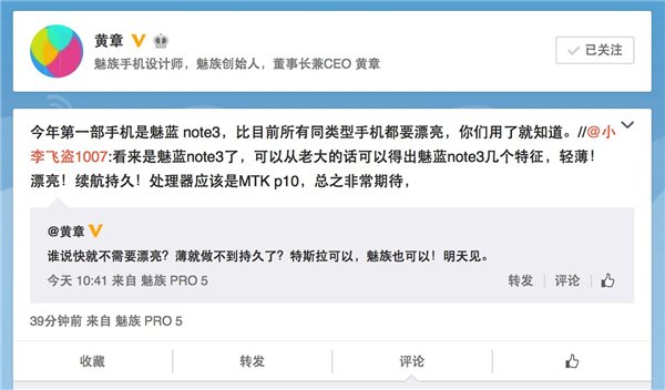 魅族创始人黄章在与粉丝互动中透露,魅族今年第一款新品是魅蓝note3,并非此前大家猜测的PRO 6。结合其上一条微博内容我们可以确定,魅蓝note