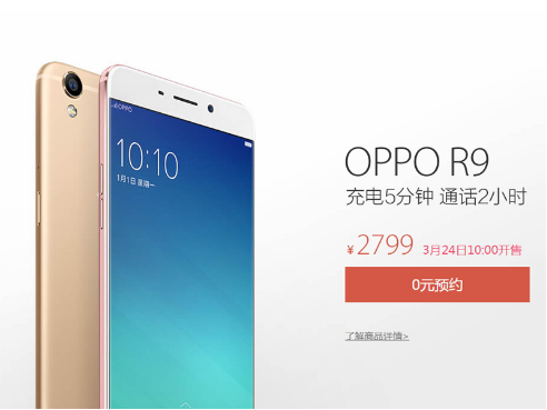 万众期待的OPPO R9即将于2016年3月24日开始销售,即日起就可以在OPPO官网、京东商城、苏宁易购等线上平台以及OPPO专卖店等线下渠道进行预约了!
