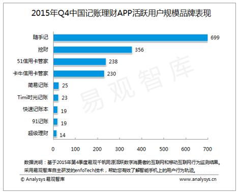 近日, Analysys易观智库发布《中国记账理财APP移动市场季度监测报告2015年第4季度》。数据显示,2015年第4季度,中国记账理财APP活跃用户总