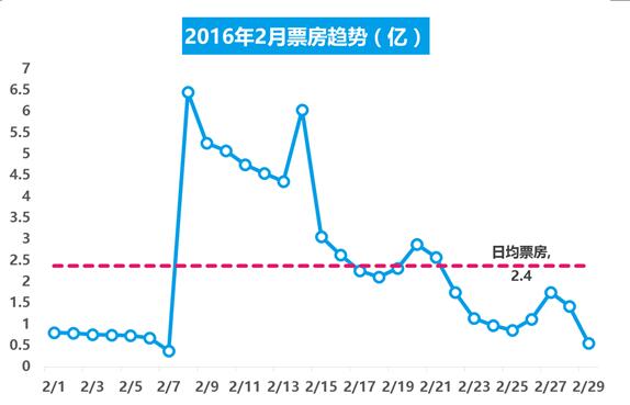 2016年2月,电影行业票房68 7亿,同比2015年2月的41亿增长了67%;春节档期7天再创36 5亿的档期票房新高;月度影片票房前三名分别是:《美人