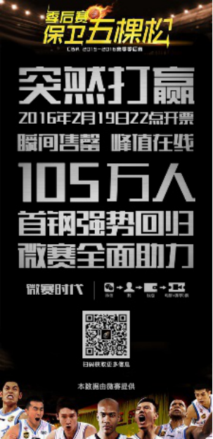 微赛时代助力CBA联赛票务销售再创佳绩!2015-2016赛季CBA联赛,季后赛第四场北京首钢男篮主场对战新疆于19日晚间22点正式在“微票儿”上开票,