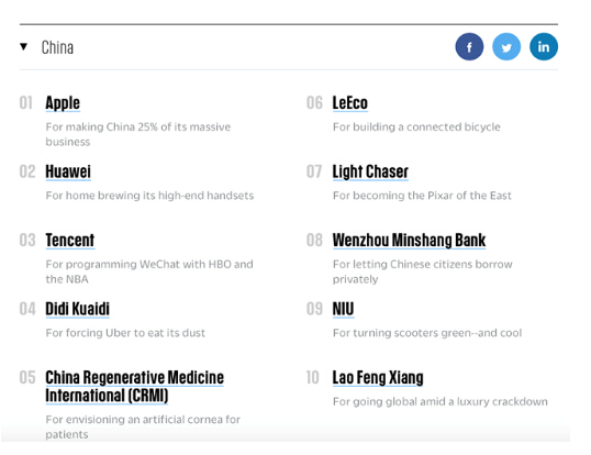 今天,美国商业杂志《快公司》发布了“中国十大最具创新力企业”榜单,全球顶尖互联网科技公司乐视LeEco与苹果一起位列其中。