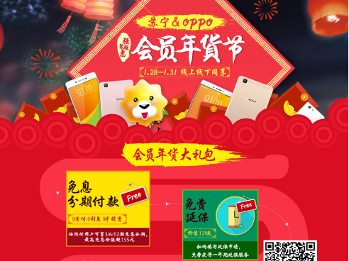 苏宁&OPPO会员年货节开始啦!凡在2016年1月28日~31日在苏宁易购线上和线下门店购买OPPO R7s,可以免费获得价值129元的一年延保服务和50元苏宁易券!