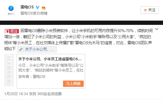 近日,雷电OS针对小米公司及其员工近期在社交平台上散播的谣言再发声明,称因雷电OS删除小米预装软件,让小米手机的可用内存提升30%-70%,续航