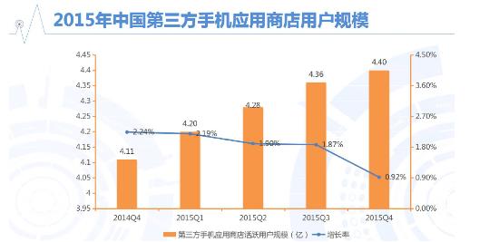 iiMedia Research(艾媒咨询)近日发布的《2015-2016中国手机应用商店年度报告》数据显示,截至2015Q4,第三方手机应用商店活跃用户规模已达4 40亿