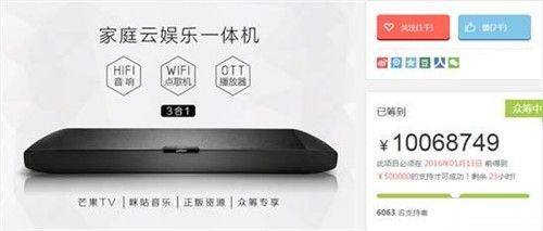 1月12日最新消息,昨日晚间23时左右,yobbom家庭云娱乐一体机项目众筹金额突破千万,以超20倍众筹目标金额的疯狂表现,成为京东众筹平台2016年