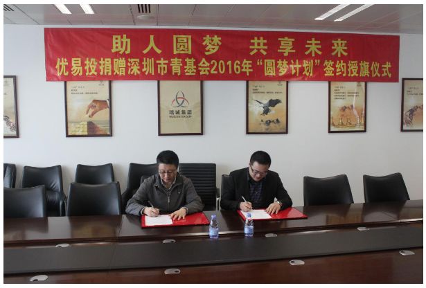 2016年1月5日,深圳前海优易投互联网金融服务有限公司(简称优易投)为支持深圳市青基会2016年“圆梦计划”捐赠了20万元(100人),并举行了签