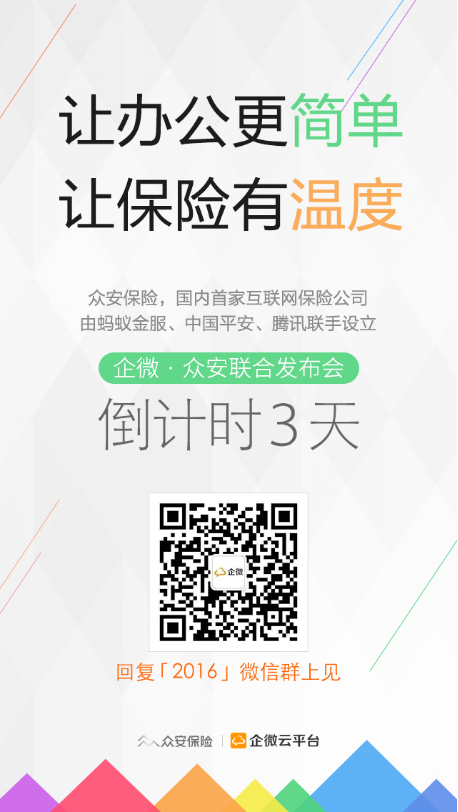 近日,企微云平台与众安保险达成战略合作关系,将于1月6日下午举行微信发布会,众安“员工保”作为首个上线产品正式接入企微员工福利平台。