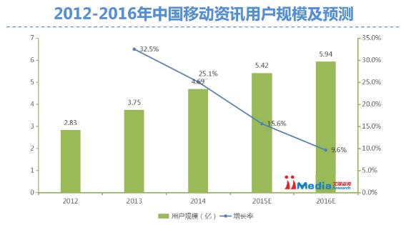 iiMedia Research(艾媒咨询)近日发布的《2015年中国移动资讯市场研究报告》数据显示,2016年中国移动资讯用户规模预计过6亿人。