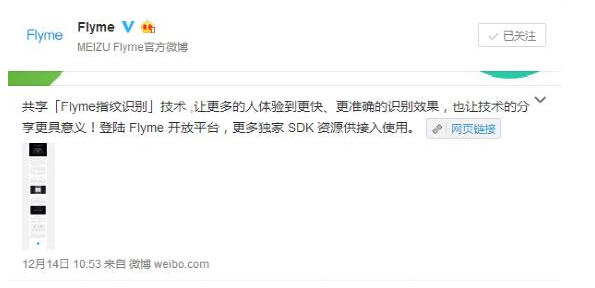 近日,魅族Flyme官方微博公布了Flyme指纹识别技术对外开放的消息,同时在Flyme开放平台上线了指纹识别相关的独家SDK资源,使得其他应用、游戏