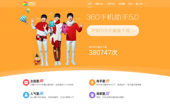 日前,国内规模最大的应用商店360手机助手公布了由当红青春人气偶像TFBOYS担任其代言人,并发布了360手机助手TFBOYS版。