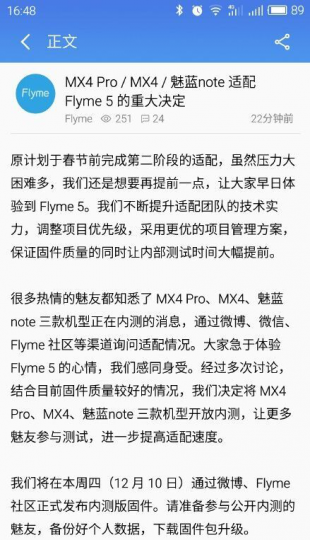 昨天,Flyme官方发布消息称:本周四(12月10日) 将发布MX4 Pro、MX4、魅蓝note 三款机型适配 Flyme 5的内测版固件,公开进行内测。