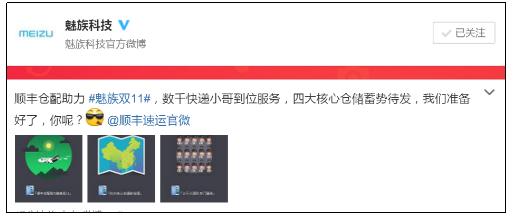 距离双11电商大促还有5天,各大手机品牌已经进入了双11模式,决心在双11大战中获得好成绩。魅族科技今天发表微博表示,“顺丰仓配助力 魅族双11